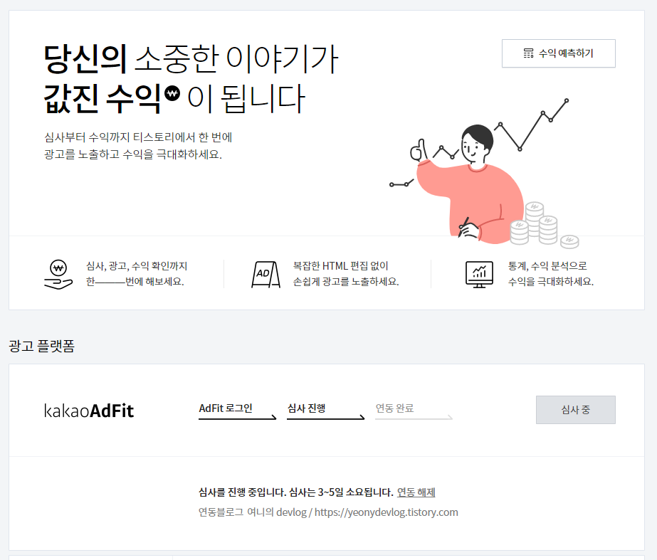 생각보다 카카오 애드핏은 심사도 빨리 진행되고 + 가장 간편하게 연동이 되는 수익 서비스같았다.